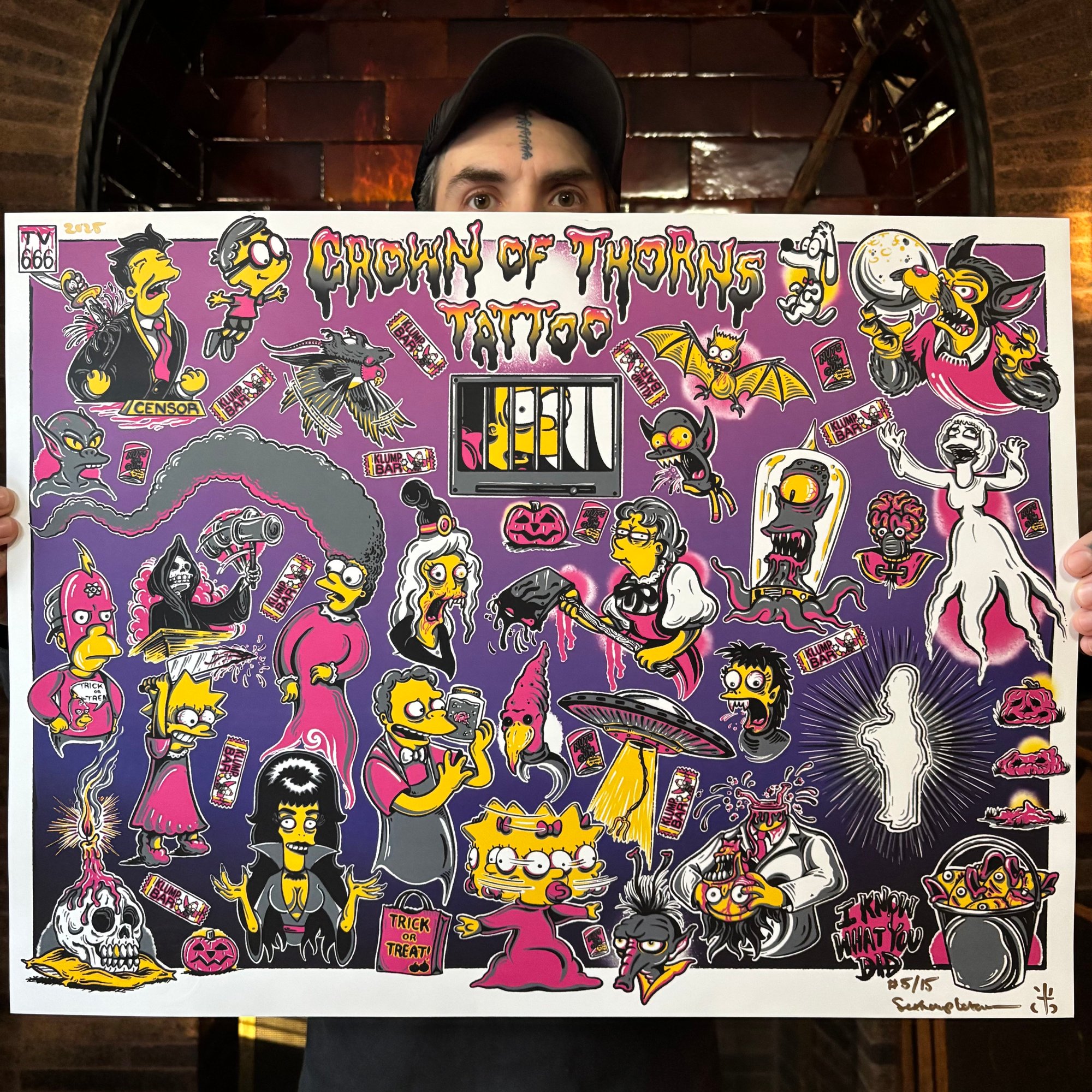Crown of Thorns / Treehouse of Horror tattoo flash pork chop styled posters. Originally made for our 2025 4th Annual Halloween Flash Day at the shop. These were only available in person the day of the event, now available online to reach our long distance supporters.
