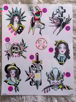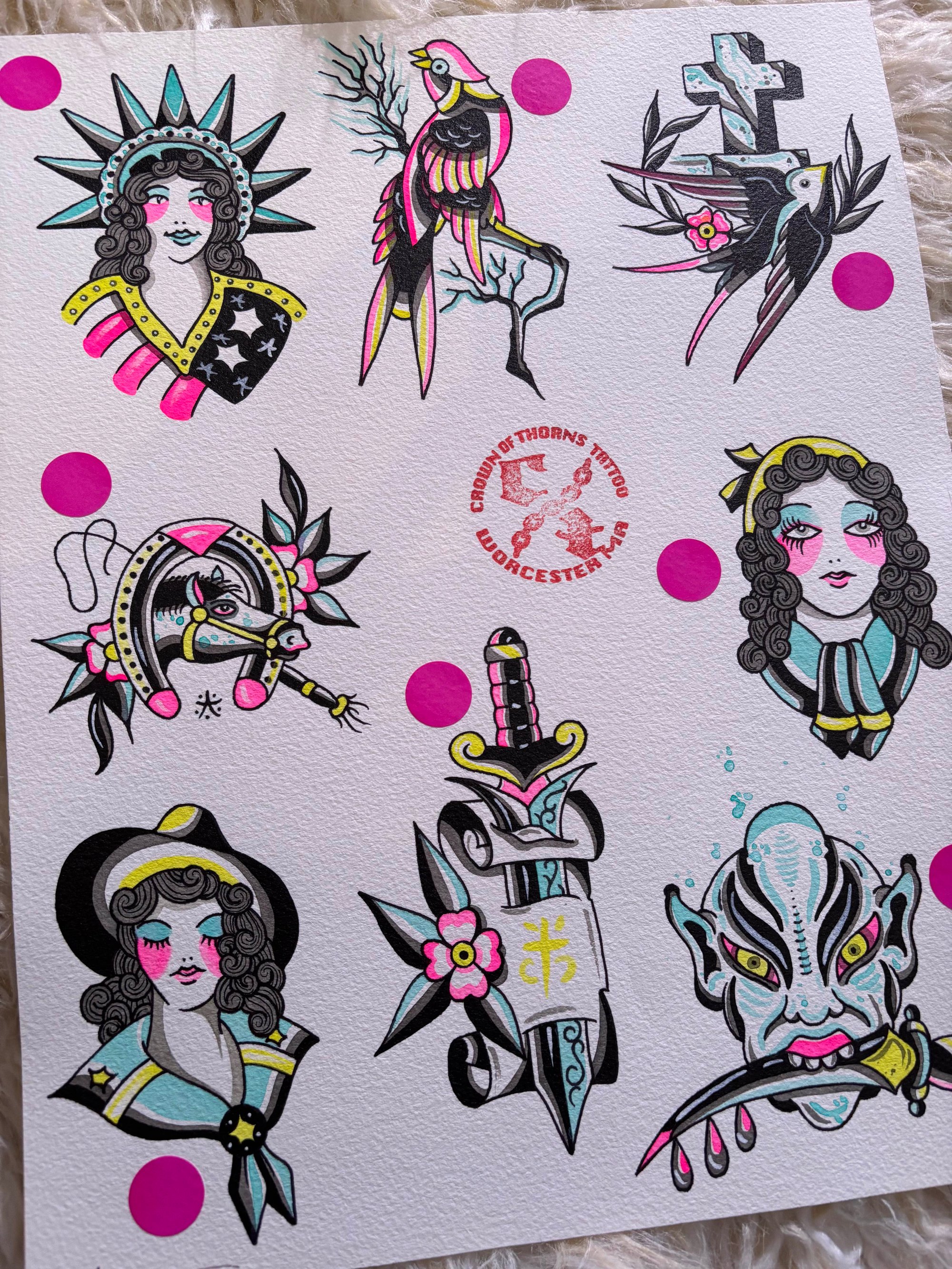 An original flash sheet painting from 2019. Slightly modernized traditional tattoo imagery. One of four done with this specific and limited color palette. Painted with acrylic gouache on 140lb cold press w/c paper. Measures 11"x14", the tall way. Hand stamped and signed. No prints were ever made from this small set of 4 paintings.