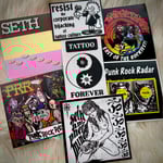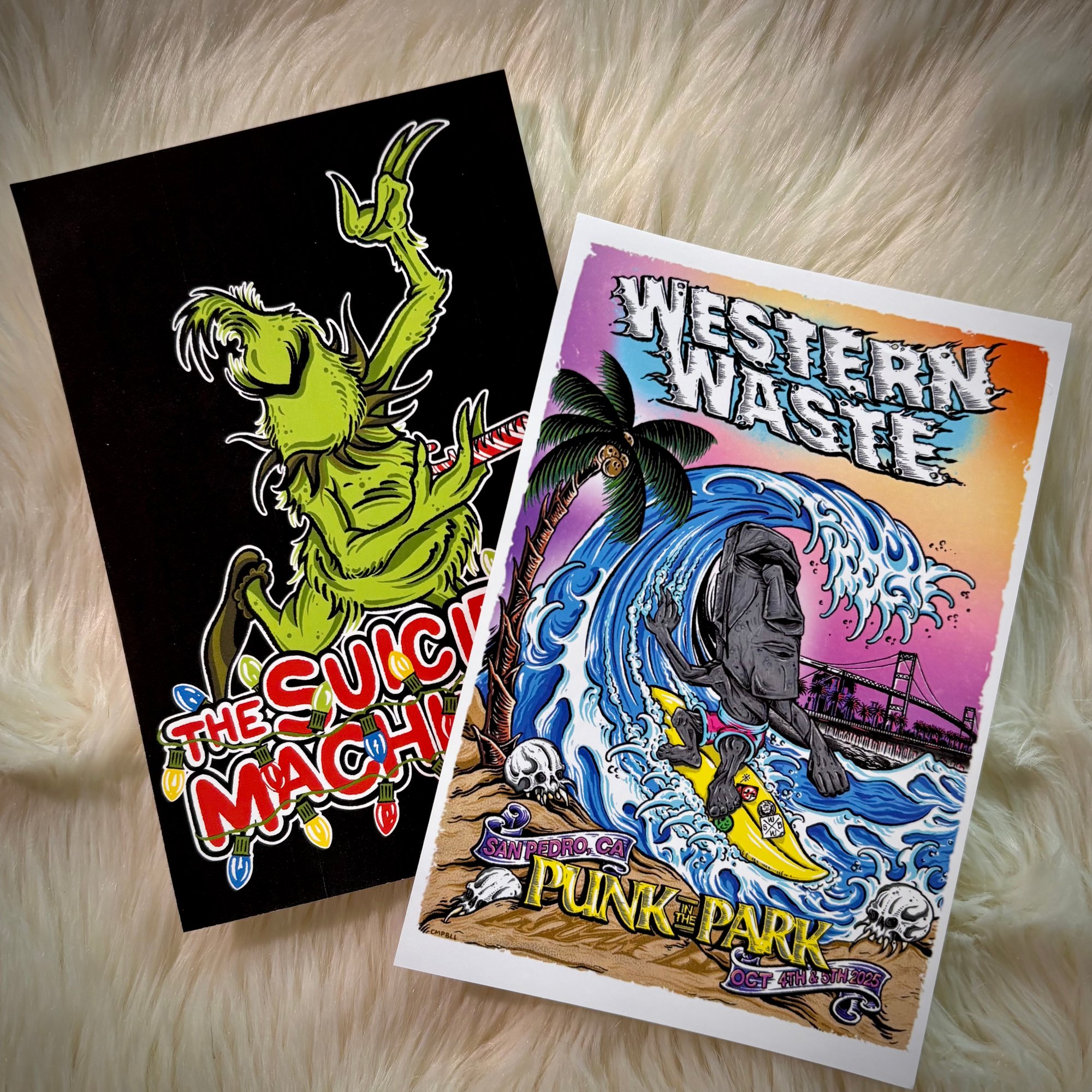 Lot of stickers, postcards, and flyers! Included in the bundle is 7 vinyl stickers including 2 featuring artwork done for Punk Rock Radar. Also included is 3 postcards suitable for mailing or collecting as well as 2 flyers featuring artwork done for Detroit legends The Suicide Machines ( limited run of xmas shirts ) and CA based punk band Western Waste ( flyer for their Punk in the Park show ).